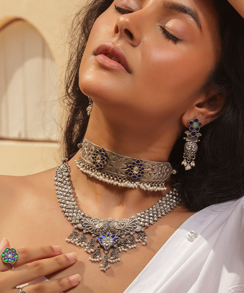 Oxidized Silver Choker Necklace with Colorful Stone Work