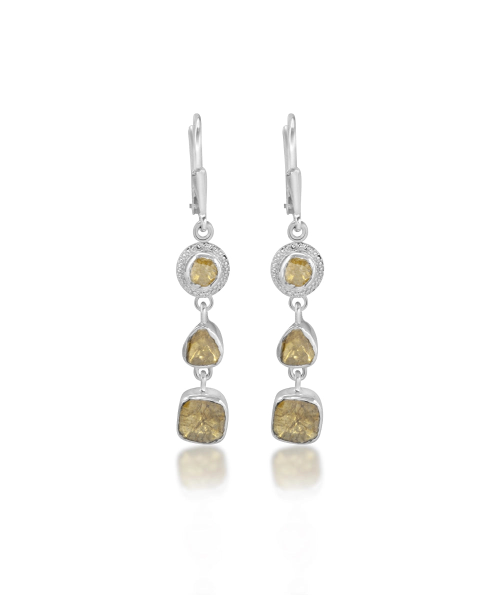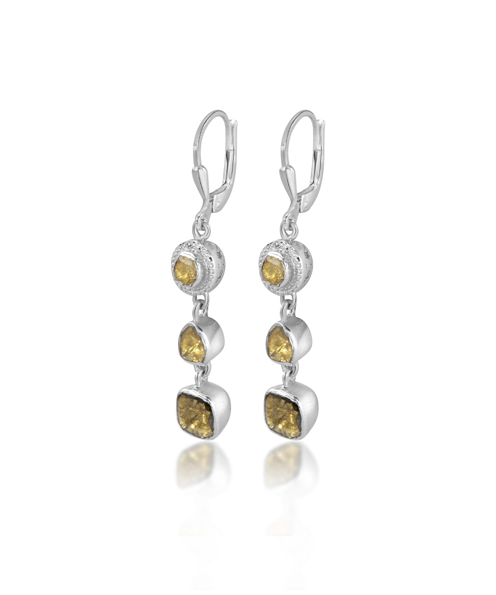 Elegant silver dangle earrings featuring a vertical line of three faceted yellow Polki diamonds secured with a sophisticated lever-back closure
