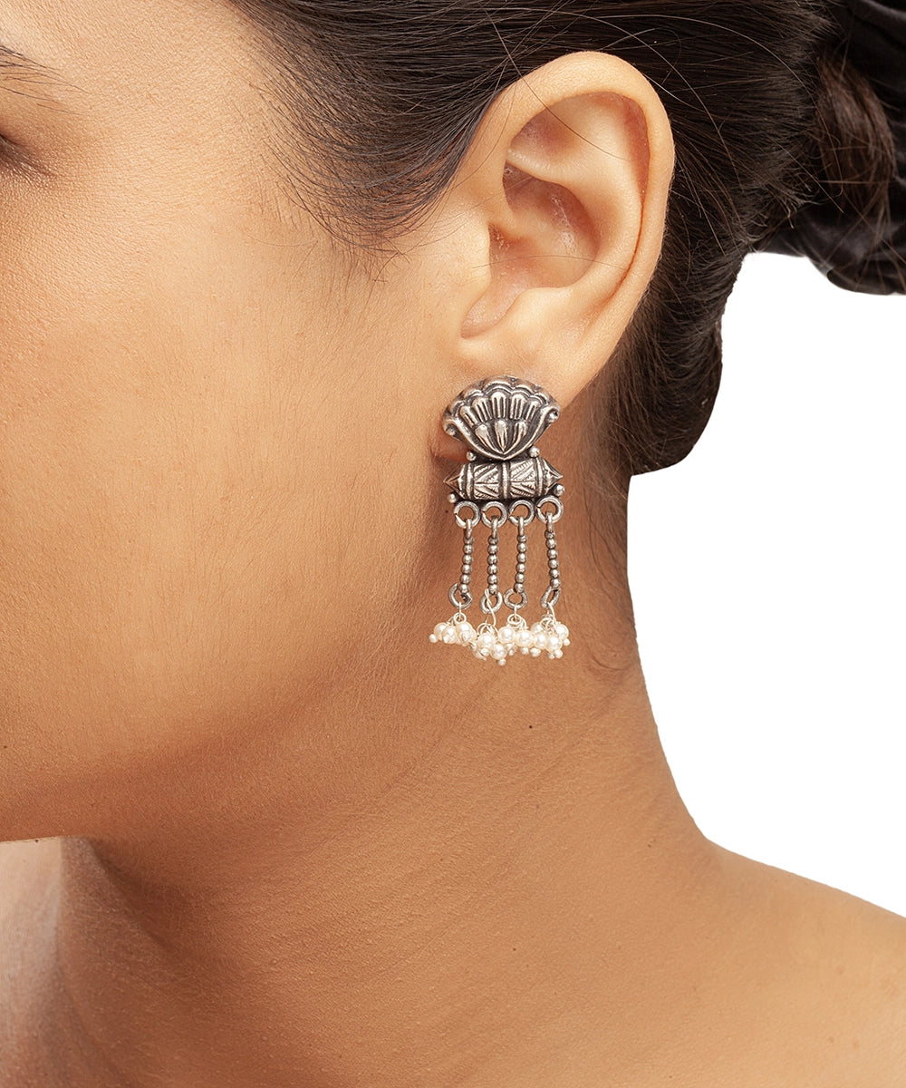 These are a pair of antique silver earrings. They feature an intricate, textured stud design, with dangling chains of small white pearls clustered at the bottom