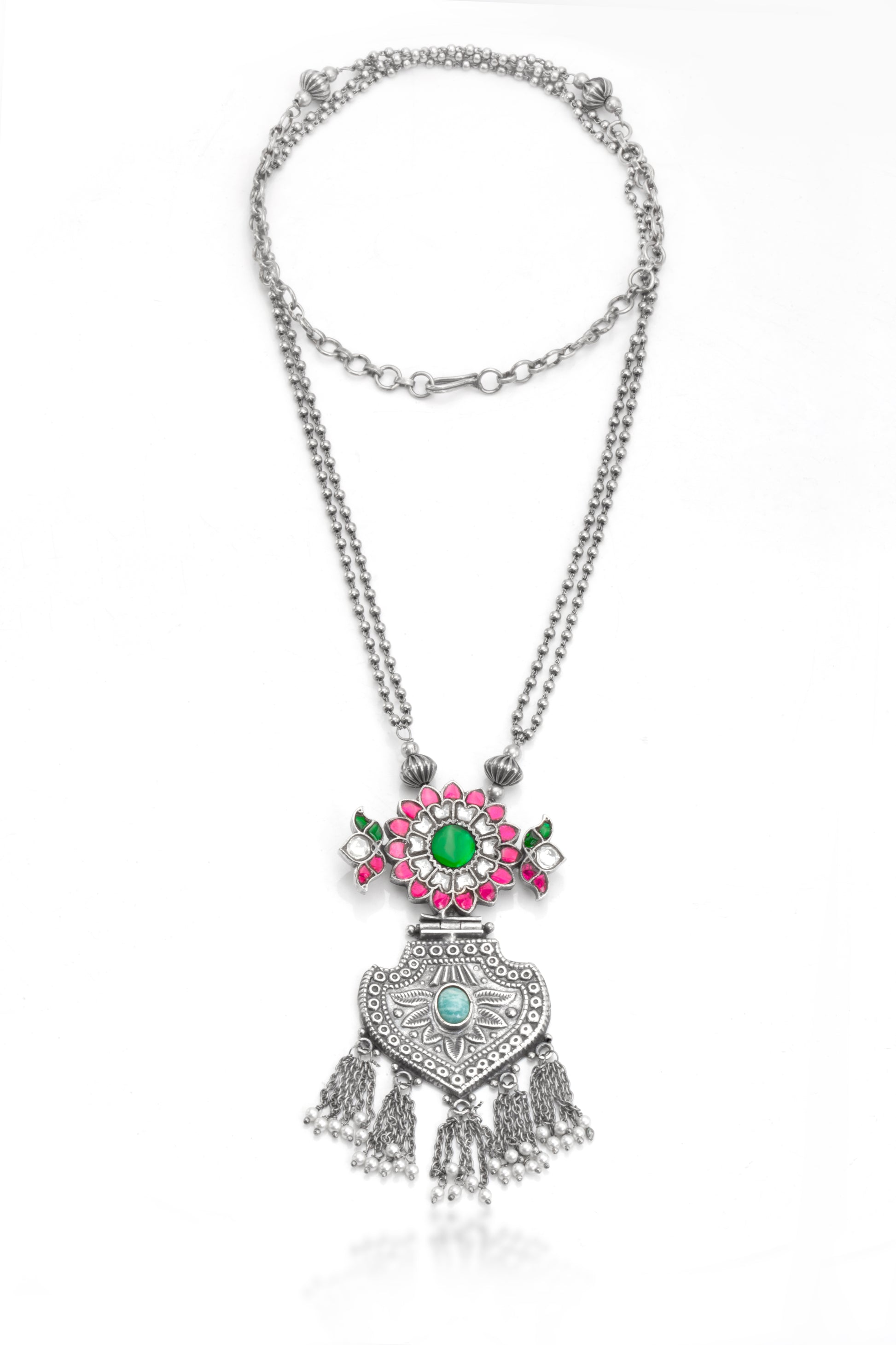 This oxidized silver necklace features an intricate central peacock motif highlighted by vibrant kundan work and finished with delicate silver fringe tassels that dance with every movement