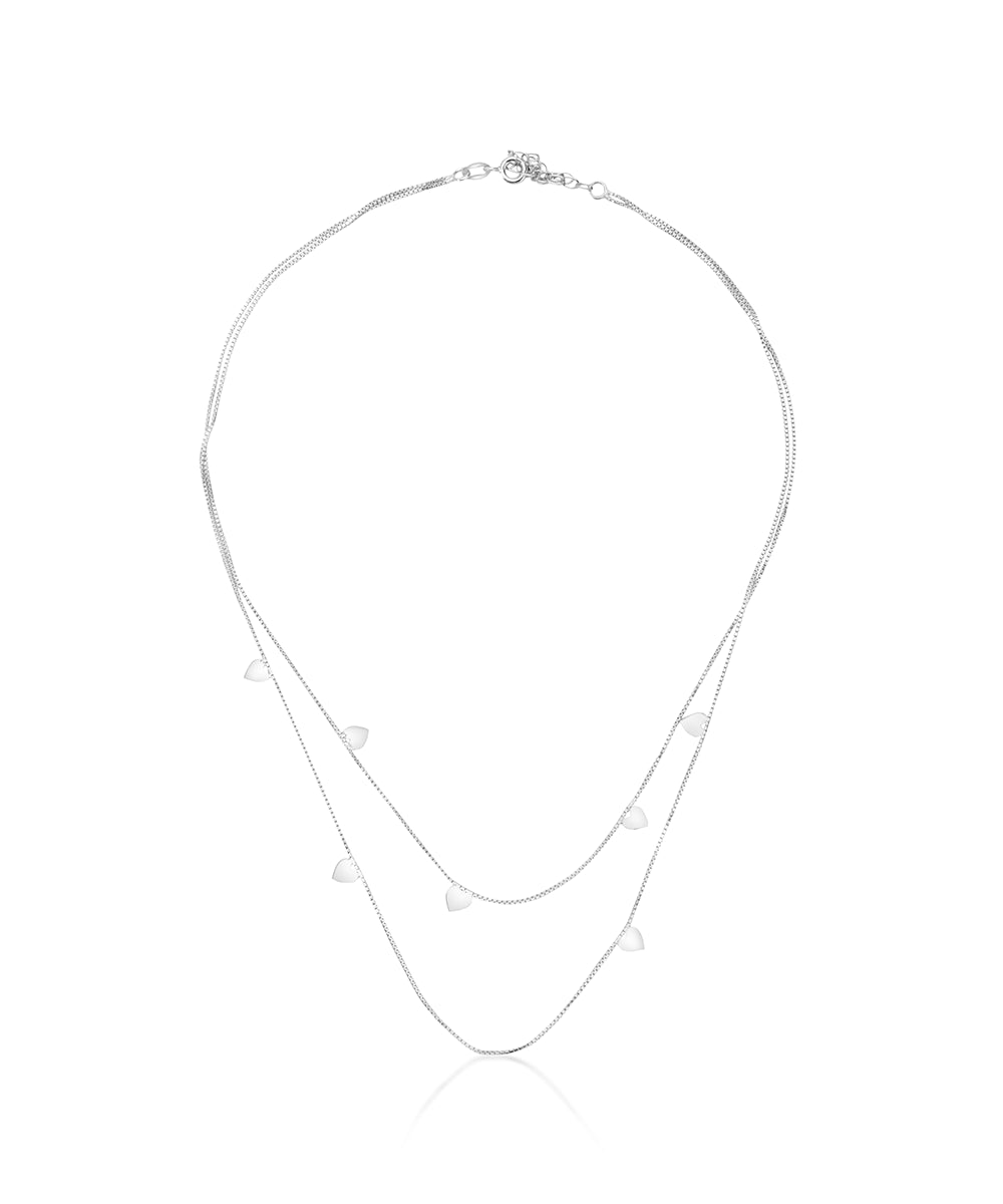 This necklace features two perfectly spaced chains connected by a single clasp, ensuring a hassle-free, tangle-free style. Both fine chains are gracefully accented with multiple small, polished heart charms placed at intervals