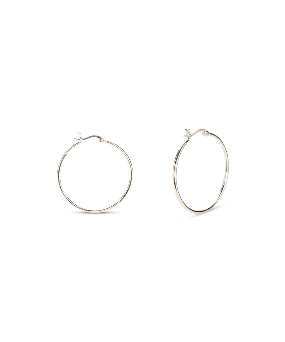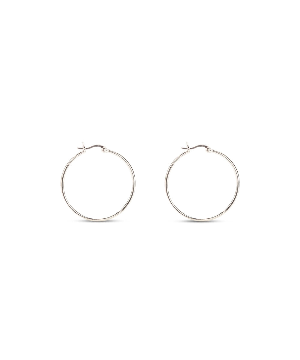 A pair of sleek, medium-to-large silver hoops feature a secure hinge clasp closure.