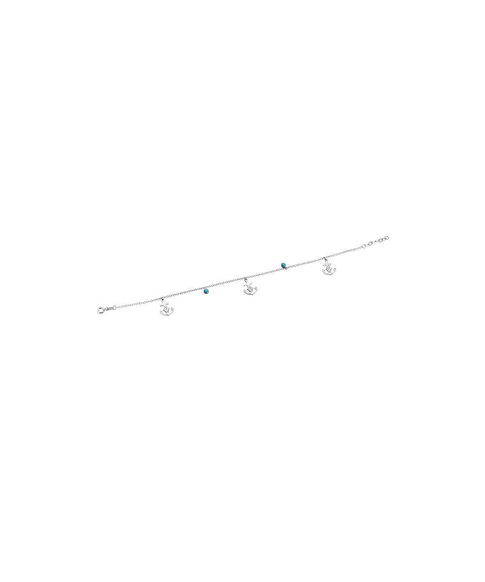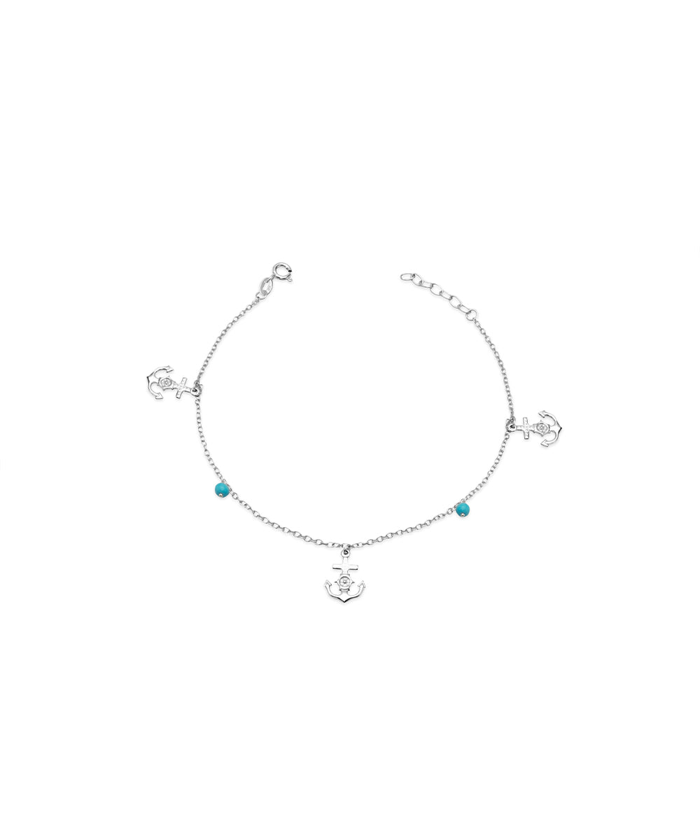 A silver dangle anklet featuring three spaced-out anchor charms interspersed with two light blue-colored bead drops. The anklet has a clasp closure and an adjustable chain extension