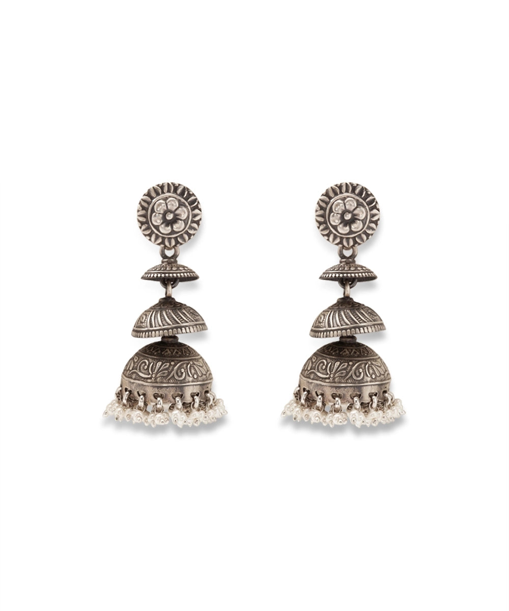 These jhumkas feature a decorative floral post and three descending, intricately carved, bell-shaped domes adorned with small pearls and a secure post-back closure.