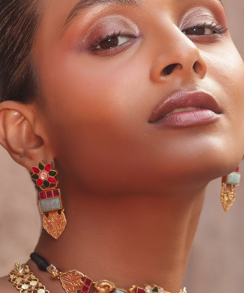 Traditional Silver earrings with an antique finish with central floral Kundan motif with vibrant pink, green, and white stones, flanked by intricate gold panels