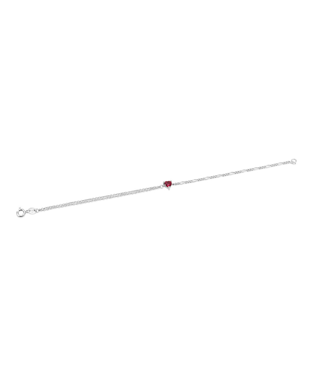 A delicate silver bracelet featuring a solitaire heart-cut red cz stone set at the center, consisting of two different chains, creating a layered and sophisticated look