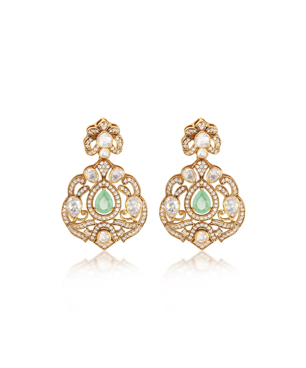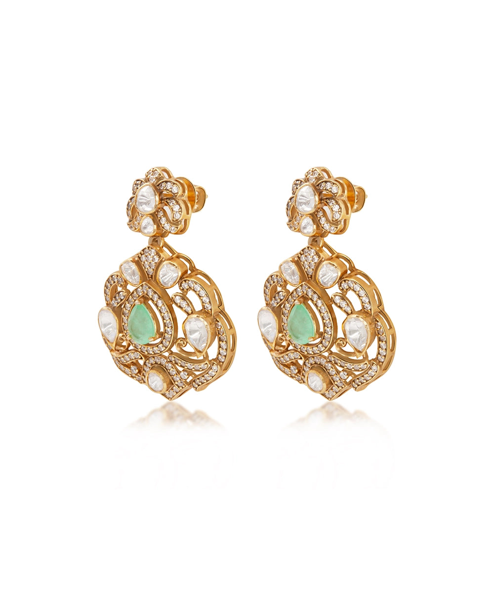 Traditional Jadau style drop earrings with an intricate, floral-inspired design featuring white uncut moissanite stones and green doublet stones