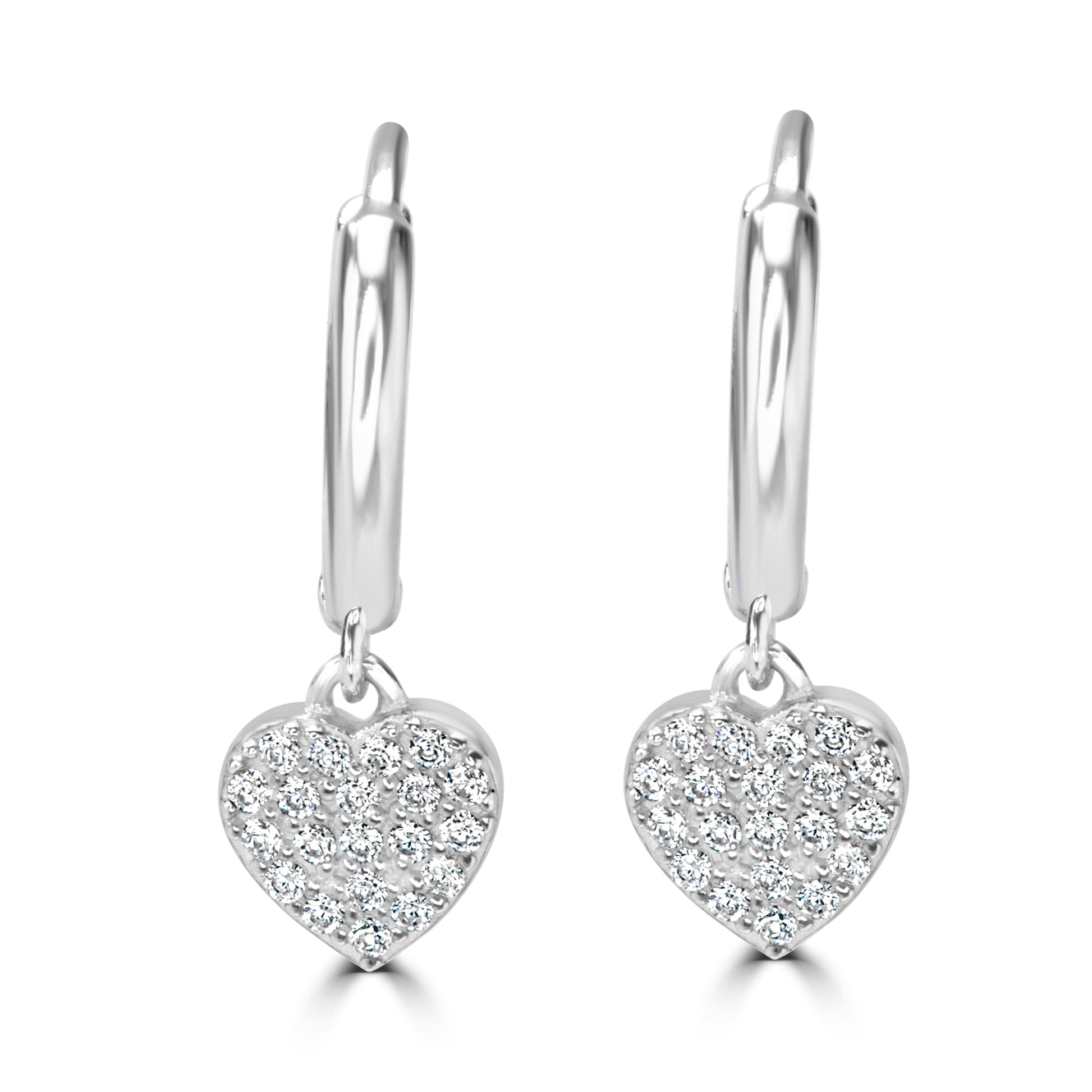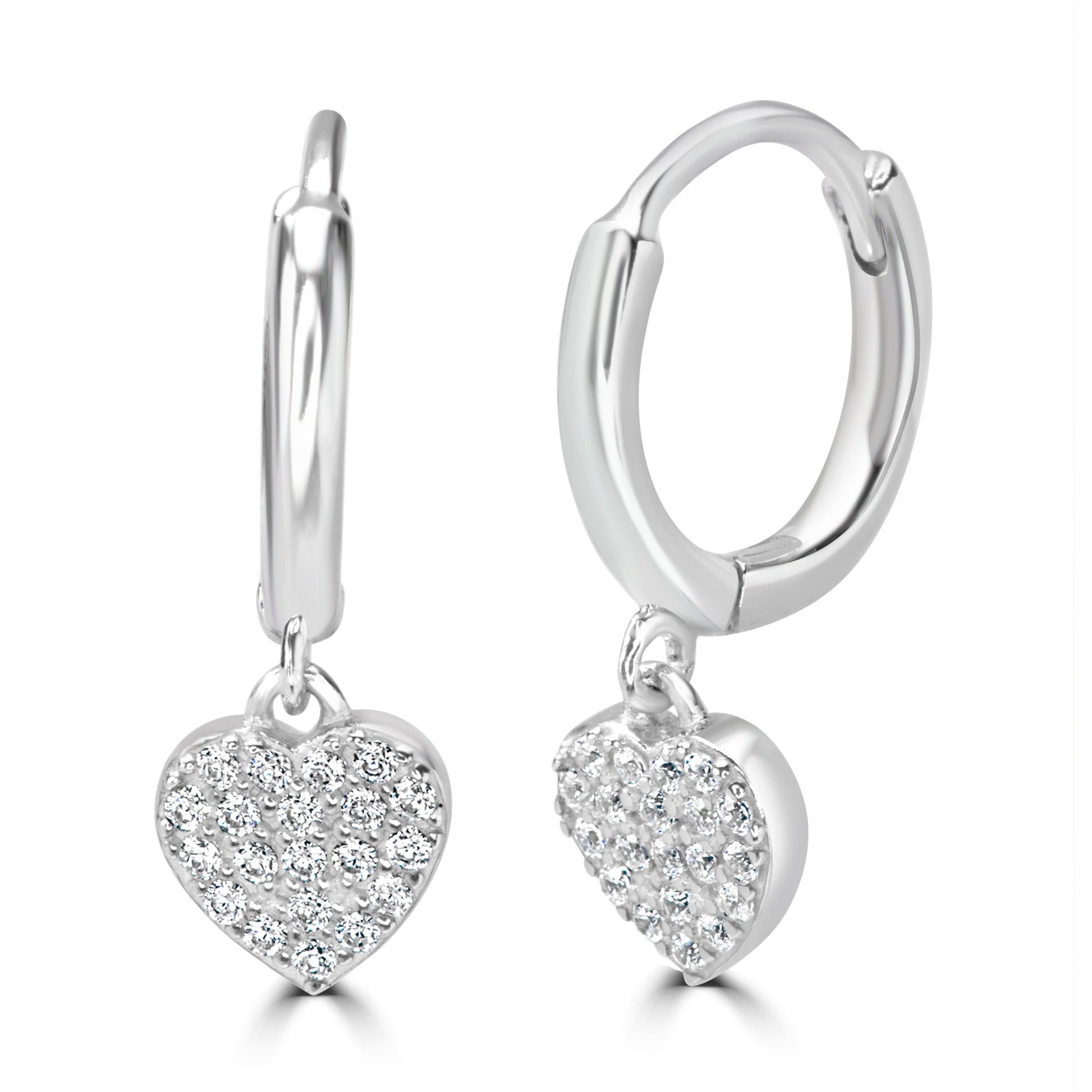A pair of dainty silver huggie hoop earrings with small heart charms dangling from them. Each heart is completely covered in pave-set cubic zirconia for a brilliant, sparkling look