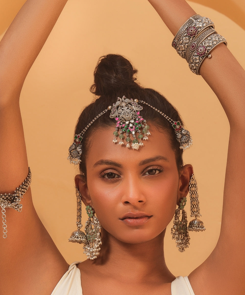 This is an oxidized silver long necklace featuring the classic Peacock motif, beautifully enhanced with vibrant pink and green kundan stones, and delicate pearl clusters